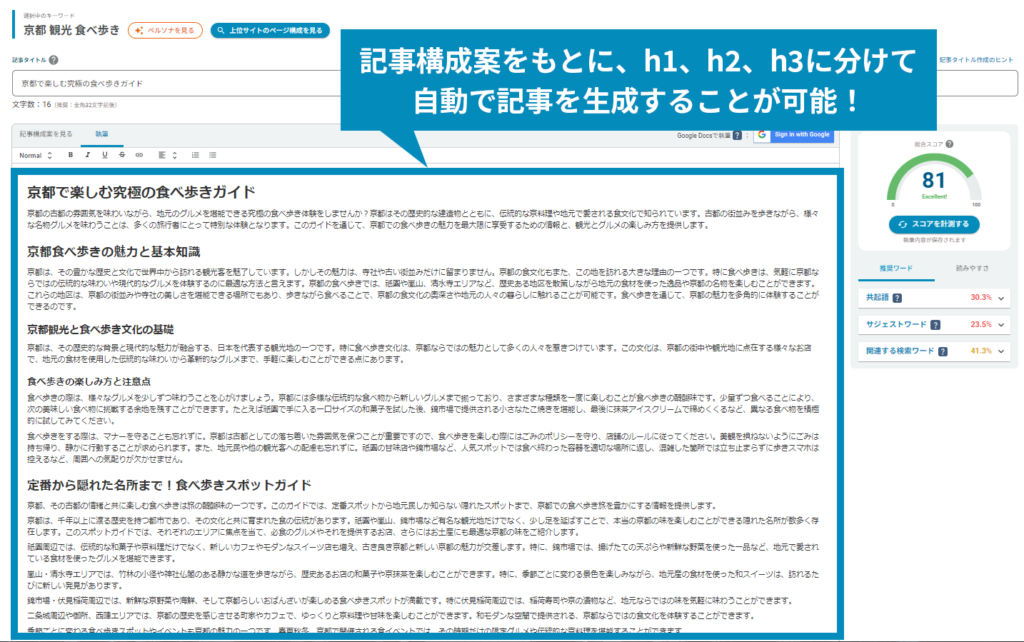 記事構成案をもとに、h1、h2、h3に分けて、自動で記事を生成することが可能です。