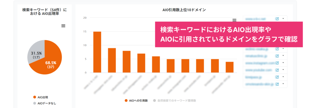 気になるキーワードにおける最新のAI Overviews出現状況を、グラフや一覧表示を通じて直感的に把握できるようになりました。