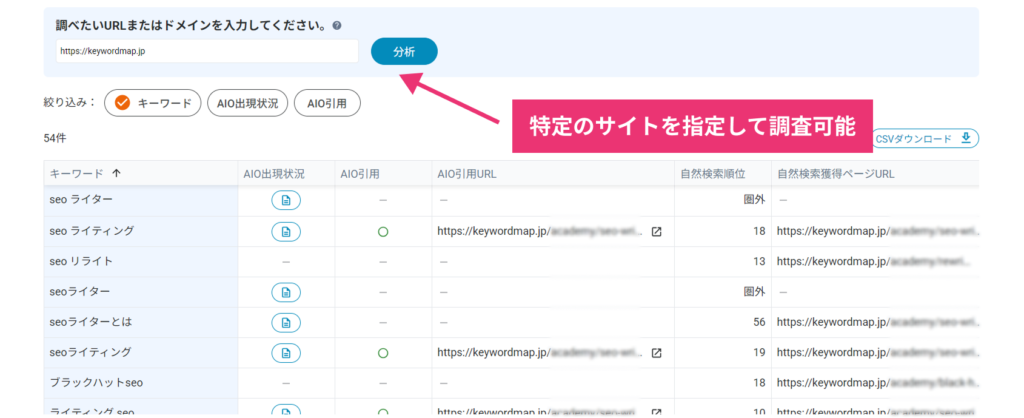 - AI Overviewsの有無や引用状況をキーワードごとに一覧化