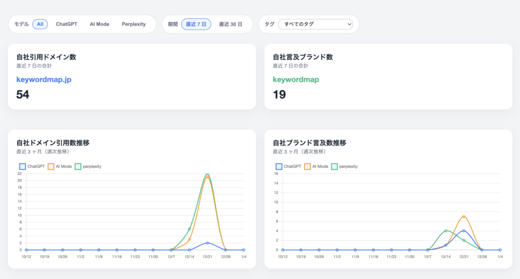 ダッシュボードによる可視化:自社ドメインの引用数やブランドの言及数、それぞれの推移をグラフで確認できます。