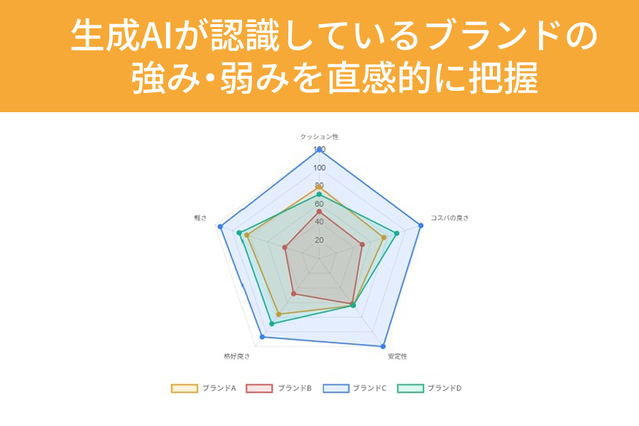 このレーダーチャートは、製品そのものの実力というよりも、“生成AIが認識しているブランドの強み”を反映しています。グラフの内容が各ブランドの実態と一致しているのであれば問題ありませんが、実際にはブランドAは「安定性」においても消費者から高い評価を得ています。その強みが生成AIに十分に認識されていない可能性があることが、この分析から見えてきました。