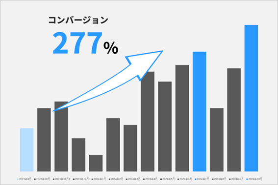 古藤月間コンバージョン数(=お問い合わせ)に関しても、コンサルティング開始前の2023年9月時点と比較して、2024年9月時点で238.5%の増加となりました。こちらも同様に、季節的な要因から数値が最大となった2024年7月時点と比較すると、276.9%の増加となっています。