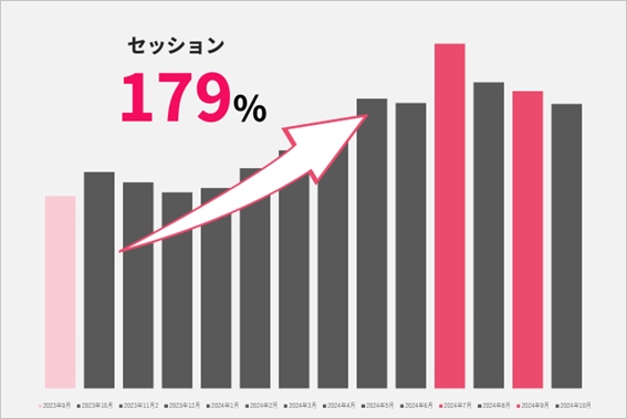 古藤月間セッション数は、コンサルティング開始前の2023年9月時点と比較して、2024年9月時点で154.4%の増加という大きな成果が見られました。なお、季節的な要因から流入数が最大となった2024年7月時点との比較では、179.1%の増加となっています。