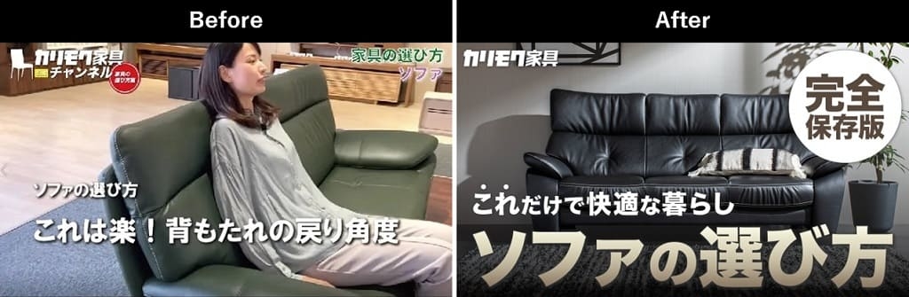 原また、カリモク家具さまのYouTubeチャンネルの視聴者は、数ある家具の中でも特にソファに関心の高い方が多い傾向にあったので、ソファに関する企画は他にもいろいろと切り口を変えながらご提案しました。例えば、「ソファの種類」「ソファのレイアウト」「ソファと床色の組み合わせ方」などです。