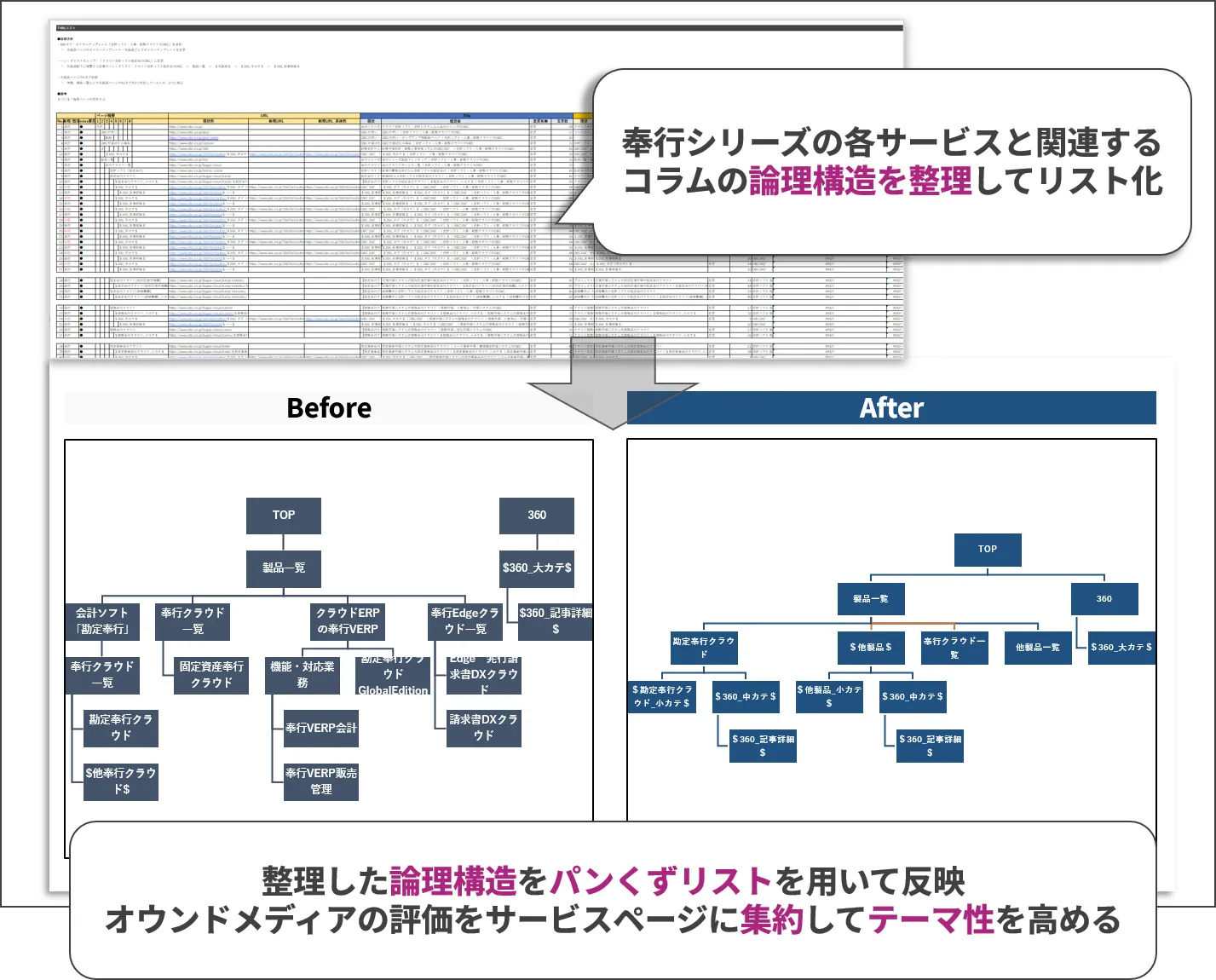 また、サービスサイトとオウンドメディアの両者が持っているテーマ性の相乗効果を狙った構造化SEOの提案も行いました。サービスそれぞれにあわせてテーマを分類し、パンくずリストを用いるなどしてオウンドメディアの構造を再構築します。これにより、オウンドメディアの評価を効率よく各サービスサイトに集約することができるようになります。このような施策は一見すると地味ですが、上位表示を促進するためにもとても重要なSEO施策であり、現在も実装いただいている最中です。