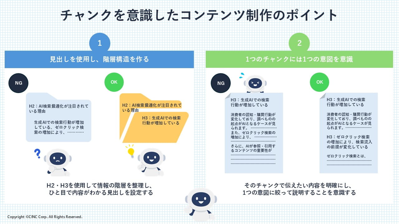 各見出しは「このチャンクでは何を説明しているのか」がひと目で分かる内容にすることが重要です。