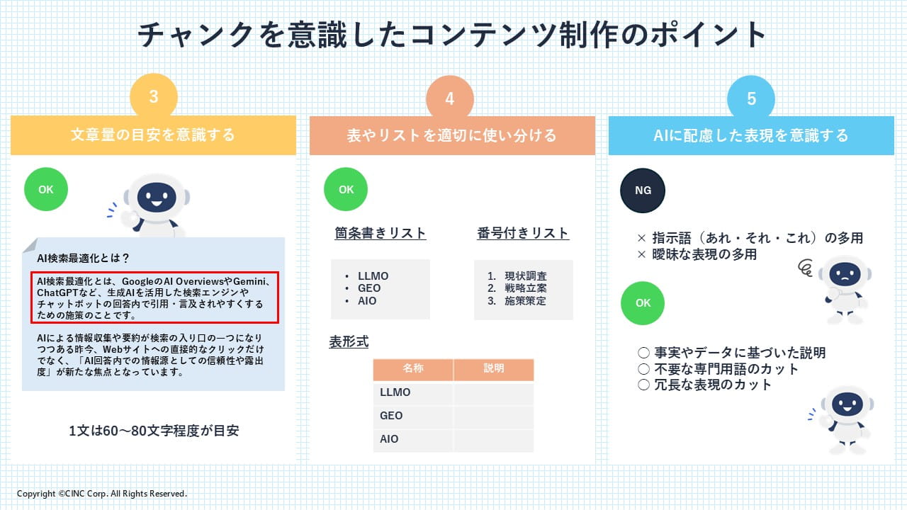 1つのチャンクだけを切り出して読んだ場合でも意味が通じる状態を目指すことで、AIによる引用や要約にも耐えやすくなります。